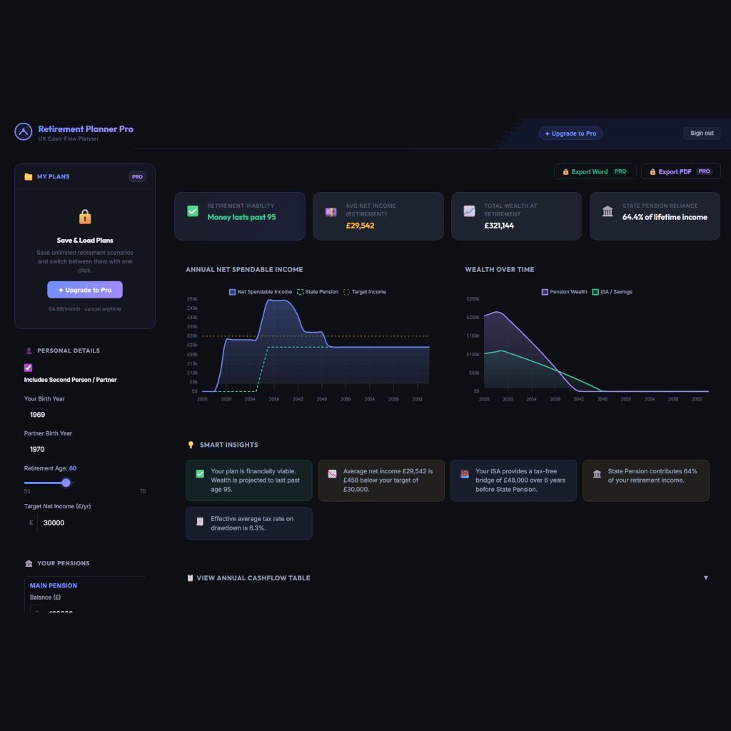 The UK retirement cash-flow planner. Master your multi-pot pensions, ISAs, and state benefits.